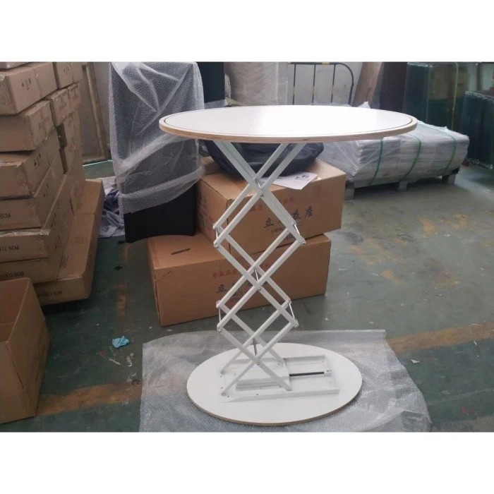 Oral Liftable Counter har en mattvit MDF-skiva som är smidig att beröra och reptålig, plus en krispig vit pulverlackerad stålsaxlyftsram – den här disken blandar hållbarhet med det där industriella-chic looken. Den starka saxmekanismen glider lätt för att justera höjden, och dess runda form ger en modern känsla, vilket gör den till en lätt underhållsfri men huvudvändande kontaktpunkt för skärmar, vare sig det är i en hektisk butik eller en elegant mässmonter.